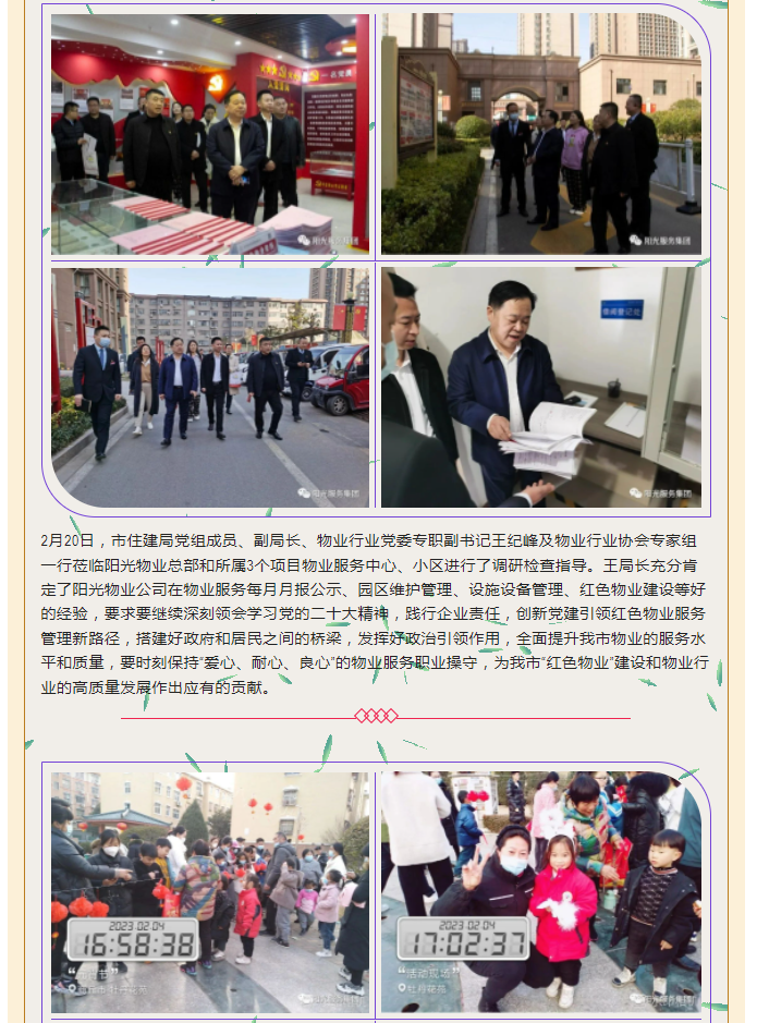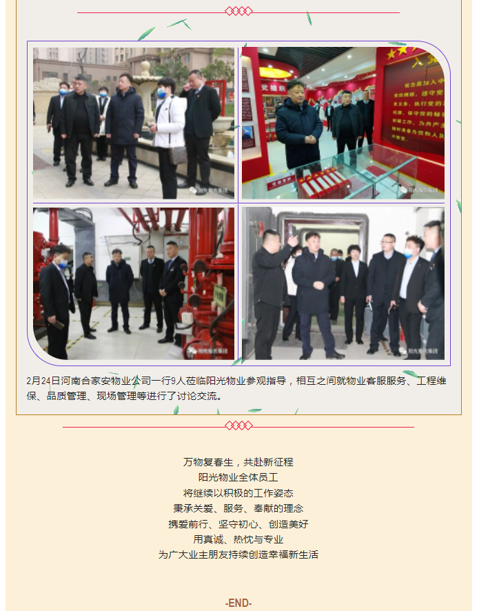 陽光物業(yè)成立于2003年5月,專注物業(yè)服務行業(yè)20余載,陽光物業(yè)現(xiàn)為河南省物業(yè)管理協(xié)會副會長單位、商丘市物業(yè)管理協(xié)會副會長單位,公司注冊資金1020萬元,陽光物業(yè)連續(xù)多年被河南省及商丘市評為先進企業(yè)、優(yōu)秀企業(yè)。