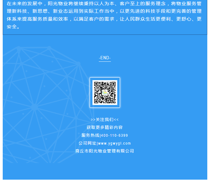 陽光物業(yè)成立于2003年5月,專注物業(yè)服務(wù)行業(yè)20余載,陽光物業(yè)現(xiàn)為河南省物業(yè)管理協(xié)會(huì)副會(huì)長單位、商丘市物業(yè)管理協(xié)會(huì)副會(huì)長單位,公司注冊(cè)資金1020萬元,陽光物業(yè)連續(xù)多年被河南省及商丘市評(píng)為先進(jìn)企業(yè)、優(yōu)秀企業(yè)。